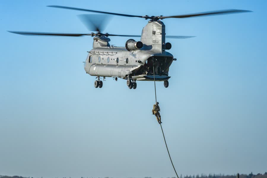 Militairen van de land- en luchtmacht hebben woensdag geoefend met een chinook boven een haven in Dordrecht. De oefening bestond uit het afdalen vanuit de helikopter via een touw, het zogenaamde fastropen.