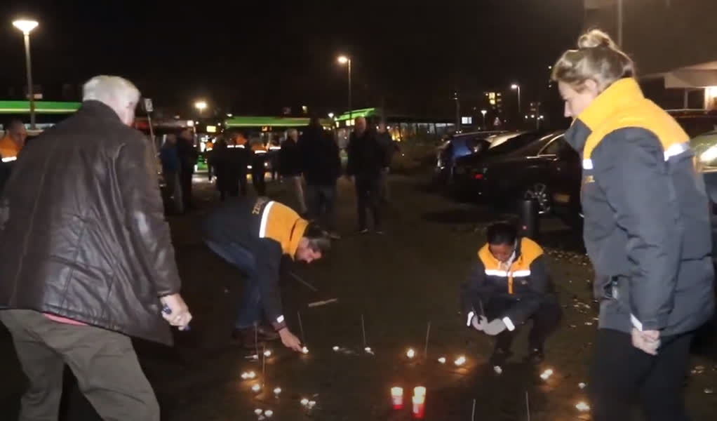 Tientallen collega's kwamen met bussen naar de Haringvlietstraat, waar ze na een toespraak kaarsjes en sterretjes aanstaken en op de klanken van 'You'll Never Walk Alone' stilstonden bij hun overleden collega. Vanaf haar balkon kreeg de vrouw van de buschauffeur alles mee.