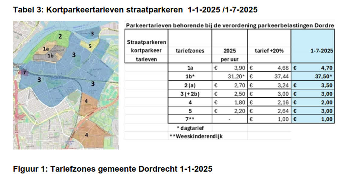 De huidge tariefzones en tabel oude en nieuwe straatparkeren tarieven Gemeente Dordrecht