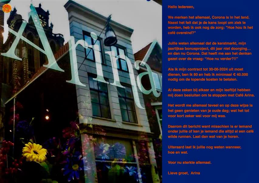 "Al deze zaken bij elkaar en mijn leeftijd, hebben mij doen besluiten om te stoppen met Café Arina. Het wordt me allemaal teveel en op deze wijze is het geen genieten van je oude dag, wat het tot voor kort zeker wel voor mij was".