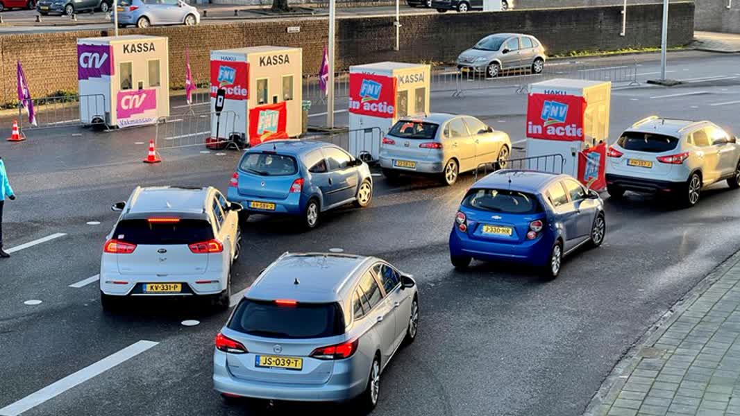 Mensen komen niet bij elkaar, maar moeten zich wel registreren voor de staking. Daar heeft de FNV dus iets op gevonden. "We hebben een staakstraat ingericht. Hier rijden de mensen in en leveren een formulier in dat vooraf al is ingevuld."