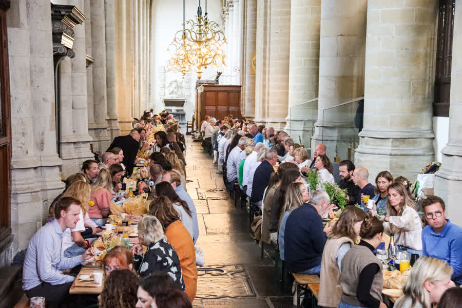Als het weer het toelaat, wordt het ontbijt buiten gehouden. Maar omdat er mogelijk een buitje zou vallen, namen organisatoren Sander en Willemijn Nobel van geen risico. En waarom ook niet: met de Grote Kerk als ‘buurman’ is daar plek genoeg.