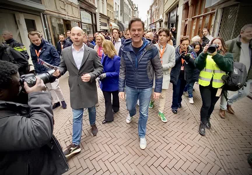 Terwijl voor- en tegenstanders op de Visbrug staan te discussiëren over de zegeningen en ellende van vier kabinetten Rutte heeft de Minister President de knop zelf al omgezet. Hij laat zich als "Mark" onthalen door het winkelpubliek en een aantal ondernemers. Met iedereen op de foto die maar wil en soms een kreet: "We hebben er weer een VVD lid bij hoor!".