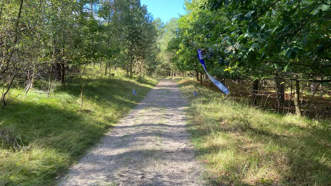 De Boswachterij is prachtig. Een vrijwilliger ruimt er de linten op. "Ze zijn al vertrokken hoor! Links, rechts en dan met de bocht mee! Let maar op de oranje pijlen." Even later komt hij naast me fietsen op de mountainbike. Hij is aardig en wil me helpen, hij wil zeker weten dat ik goed ga. We kletsen wat terwijl ik over de glooiende betonnen platen loop.