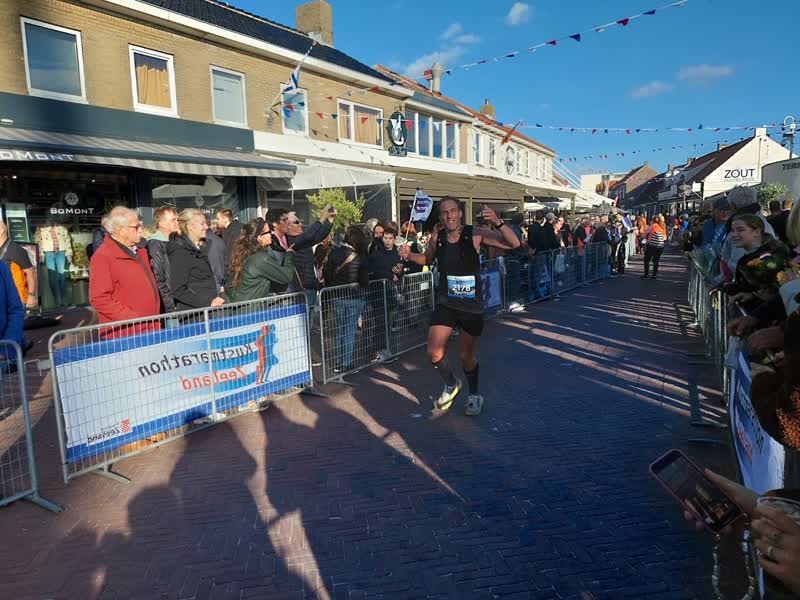 Mijn horloge piept. Ik loop nu - veel te hard, snelheid marathon sub 3 uur - door de hoofdstraat van Burgh-Haamstede. Het publiek staat er nog.