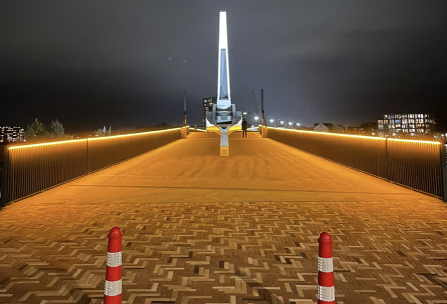 Mede door dit alles en de jarenlange discussies werd ik benieuwd naar de brug en dat leidde ertoe dat ik op een doordeweekse avond in mijn eentje de deur uitging om de brug van dichtbij te bekijken. Toen ik over de Riedijk aan kwam lopen en de brug voor het eerst zag, voelde ik een kinderlijk enthousiasme door me heen stromen. Er stonden tenten, mensen maakten foto’s en de sculpturale landmark zag er indrukwekkend uit. Ook ik maakte een foto en wilde het doorsturen naar mijn familie en vrienden. Eens te meer zorgde mijn gevoel ervoor dat mijn soms sceptische blik op de wereld werd vertroebeld en minuten lang stond ik te kijken naar een Waterbus die aan het einde van zijn dienst door de open brug voer.