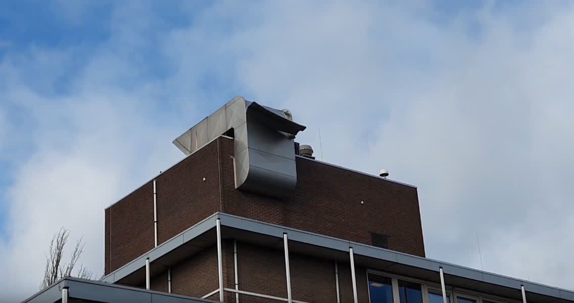 Dakdelen op het UWV-kantoor konden storm Dennis zondag niet aan. Een deel van het dak van het pand op de Spuiboulevard raakte zondag los door de harde wind.