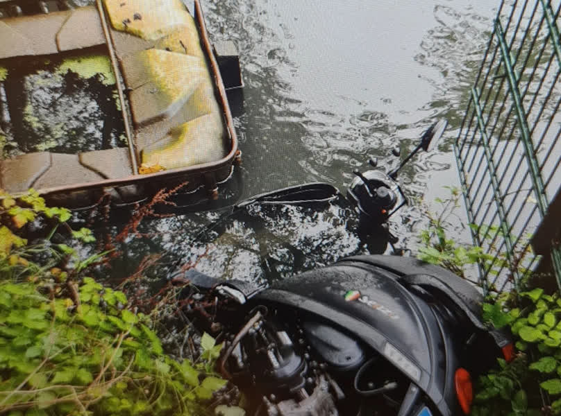 Eén van de bromfietsen werd gedumpt in een sloot in het Weizigtpark ©WijkagentenKrispijn