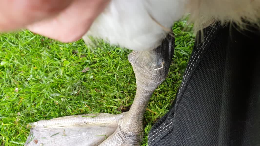 "We namen een kijkje bij de zwanen bij het Weizigtpark omdat er botulisme in het water zit. Deze liep mank en hebben we naar de kant gelokt", vertelt Maria Hamans van de DierenSOS. "Daar zagen we dat hij een nietje in zijn poot had. Die hebben we geprobeerd eruit te halen, dan kan hij meteen weer terug in het water. Maar dat lukte niet, want hij zat helemaal om zijn pees heen."
