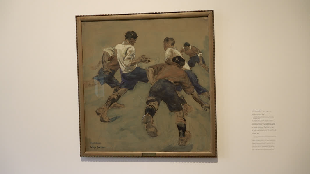 Vijf fanatieke balsporters strijden om een niet waar te nemen voetbal. Op de leren laarzen, sponsorloze shirts en het feit dat het in een museum hangt na, zou het tafereel zo op een willekeurig amateurvoetbalveld van nu plaats kunnen vinden. Het honderd jaar oude en lang verloren gewaande aquarel Football van kunstenaar Willy Sluiter hangt sinds dinsdag in het Dordrechts museum.