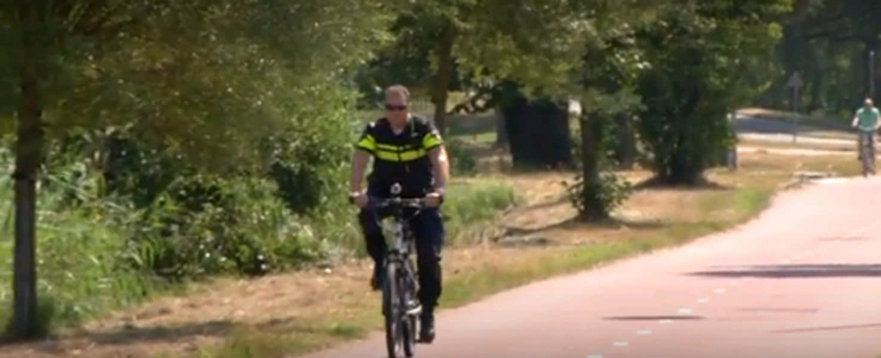 Hij is op zijn fiets niet echt jaloers op zijn collega’s die in een politiebus met airco zitten. “Als zij een melding krijgen op de A16, staan ze op het verzengende asfalt.”