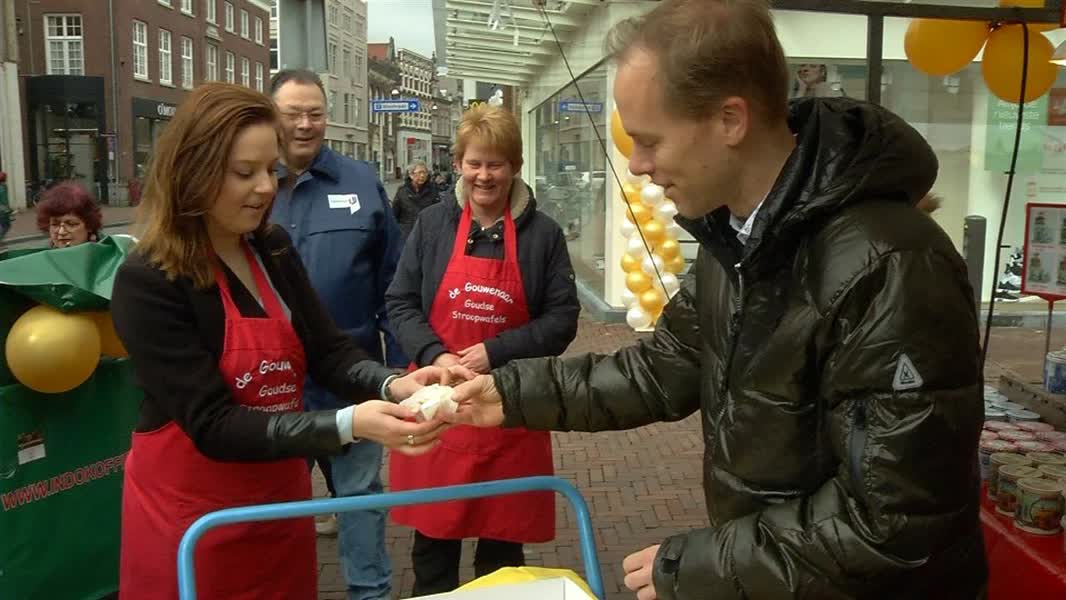 Wethouder Jasper Mos deelde zaterdag koffie met gebak uit op de Dordtse weekmarkt.