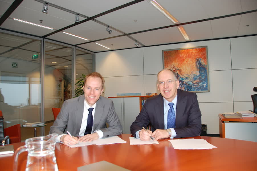 De Dordtse wethouder Jasper Mos en Ronald Paul, directeur bij het Havenbedrijf Rotterdam, hebben gisteren een handtekening gezet onder een overeenkomst die de samenwerking tussen de twee partijen wat betreft de Westelijke Dordtse Oever gaat versterken.