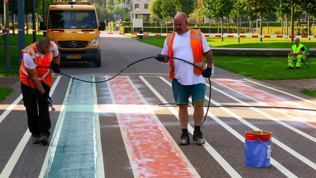 Op dit moment bestaat het zebrapad uit vijf kleuren, de zesde blauwe baan is nog leeg. De gemeente laat weten dat die binnenkort geverfd wordt.