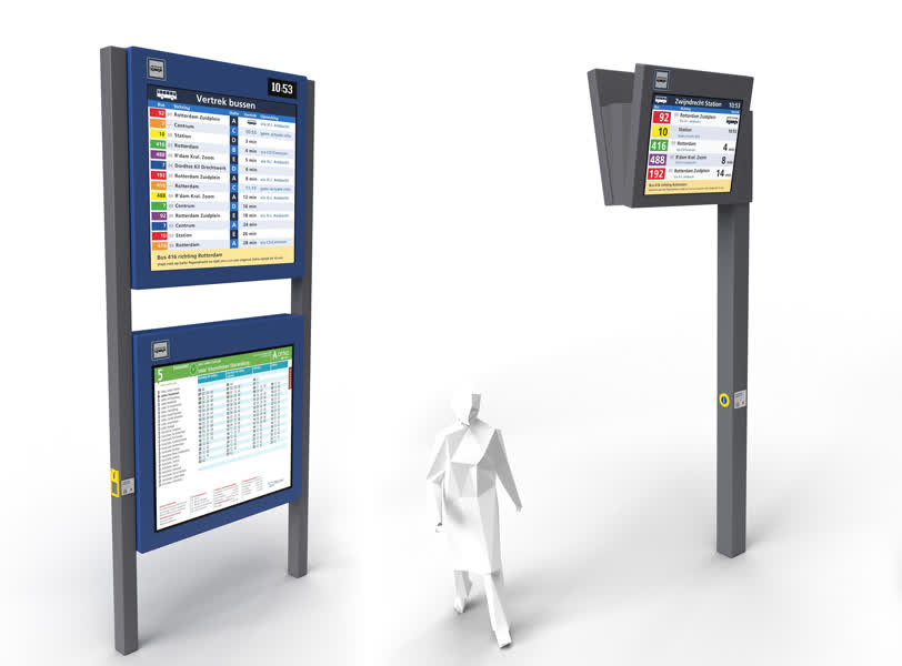 Op de borden staat hoe laat het openbaar vervoer betrekt. Ook staat er informatie over vertragingen, omleidingen en andere routes.