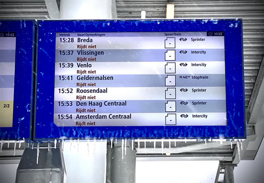 Er rijden in heel het land geen treinen van de NS. De spoordienst schrijft op haar website: "We realiseren ons dat dit een vervelende situatie is voor onze reizigers. Het is helaas niet mogelijk om op dit moment aan te geven wanneer het treinverkeer kan worden opgestart. De aanhoudende sneeuw en wind blijven hinder veroorzaken. We verwachten in de loop van de middag daar meer informatie over te kunnen geven. NS en ProRail werken er keihard aan om het treinverkeer waar mogelijk weer op te kunnen starten. Dit gebeurt stap voor stap op de plekken waar dit mogelijk is en nog niet in het hele land. Veiligheid van onze reizigers en medewerkers staat hierbij voorop."