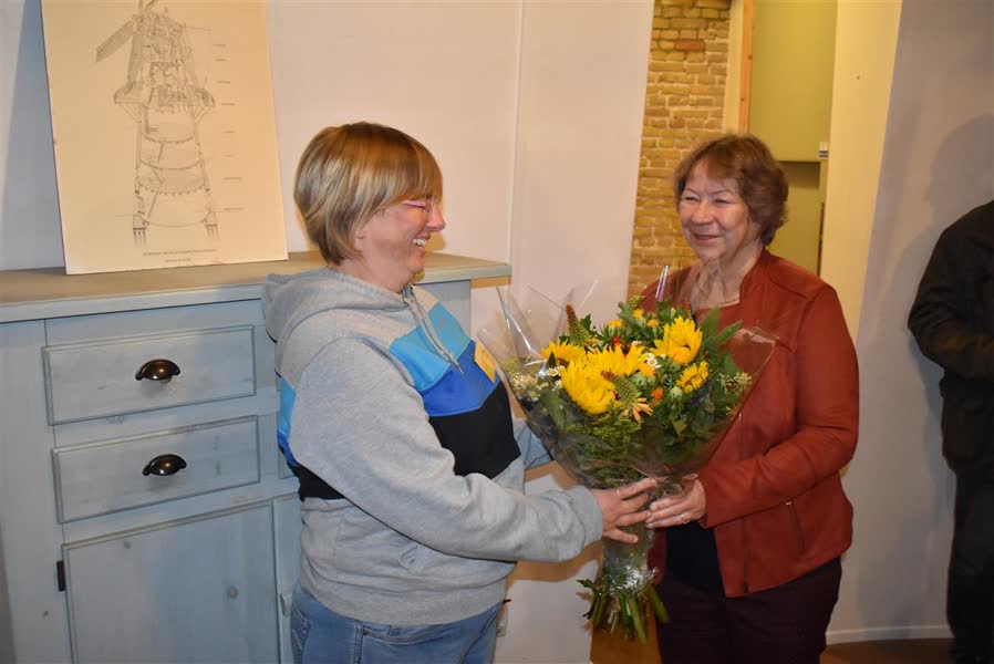 Door haarscheuren in de roeden van de wieken stond de molen stil, maar sinds zaterdag draait hij dus weer. Dat kwam voor Meta goed uit, want ze haalde haar diploma welgeteld twee dagen voordat de molen weer aan het werk kon. Voorzitter Marianne Mulders van Stichting Kyck over den Dyck heeft Meta op haar eerste werkdag welkom geheten, samen met een zaal vol genodigden en vrijwilligers.