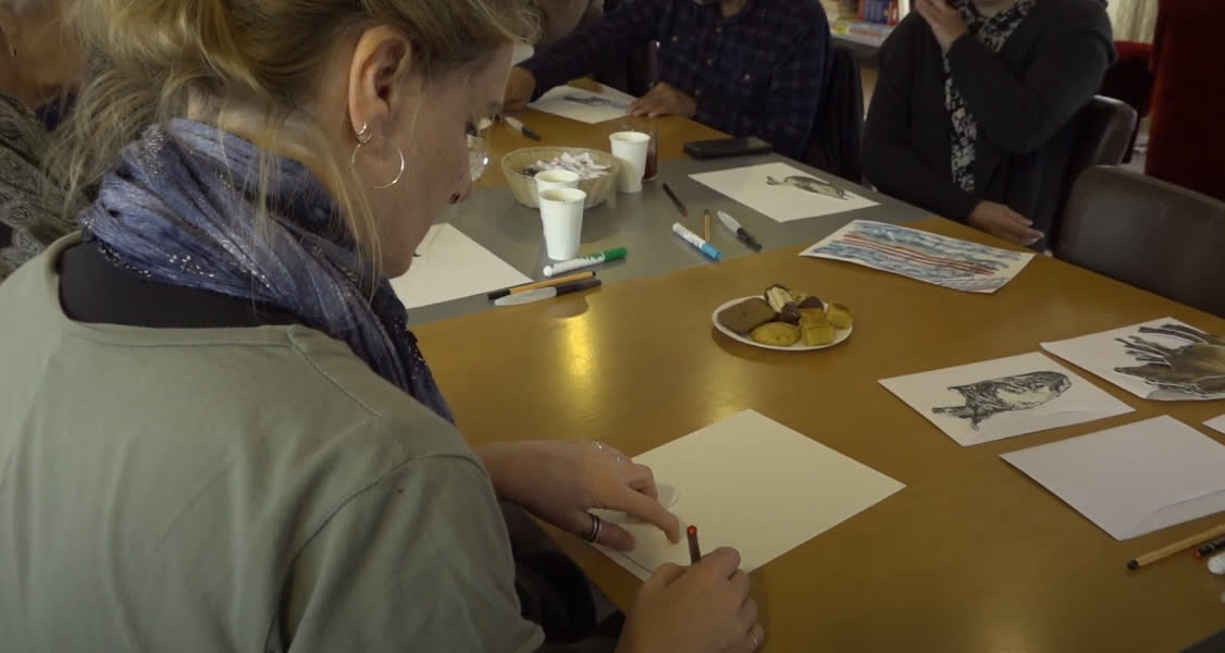 Toch moet de cursiste eraan geloven. "De vingers kunnen vies worden", waarschuwt Larisa alvast. Eerst is het tijd voor ‘doodlen’ met verschillende kleuren stiften. Doodlen houdt in dat je zomaar iets op papier zet. Maakt niet uit wat: lijnen, vierkanten, cirkels of andere krabbels. Uiteindelijk is het de bedoeling om er een dier in te zien. Nogal een uitdaging.