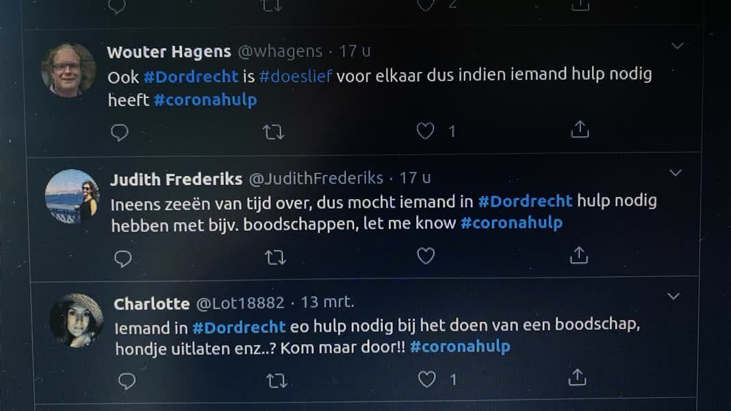 Via de hashtag #coronahulp wordt sociale media in tijden van nood ook echt sociaal. Dordtenaren van jong en oud en uit elk deel van de stad delen een oproep of ze kunnen helpen met boodschappen doen, honden uitlaten of op kinderen passen.