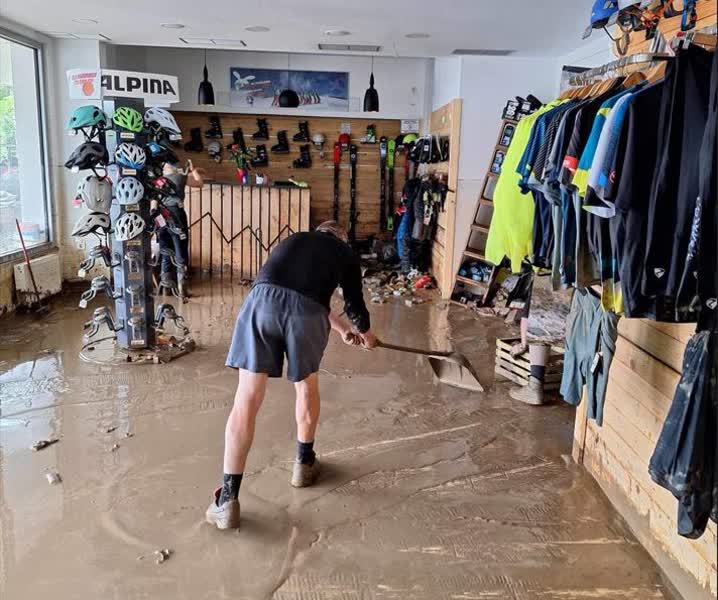 Ook de outdoorwinkel White Rabbit bij de camping wordt getroffen door de overstroming. Vanuit de winkel werden veel outdoor activiteiten georganiseerd zoals fietsen, raften en hiken. Het water komt tot wel anderhalve meter hoog in de winkel te staan die vol staat met mountainbikes, elektrische fietsen en kleding zoals skischoenen, die er stonden opgeslagen voor de winter. “Er is heel veel schade en ze zijn overal voor verzekerd, behalve voor zo’n natuurramp”, aldus Henriët.