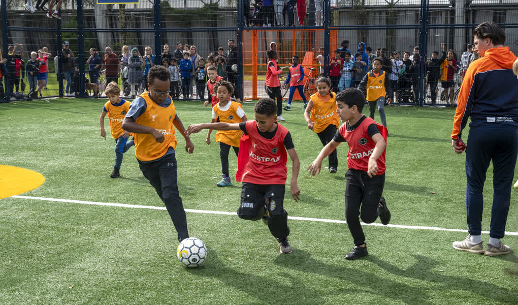Voetballende jongeren op een Cruyff Court foto: Ronald van den Heerik