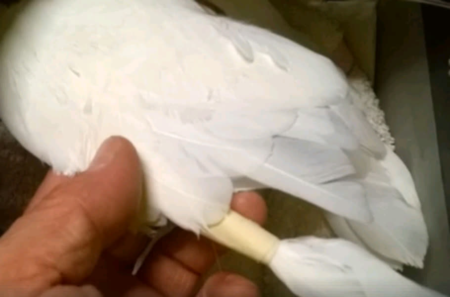 Bewoners in de Prattenburg troffen gisteren de duif aan in de tuin van de buren. De duif kon niet vliegen en daarom belden ze de dierenambulance Louterbloemen om naar de vogel te komen kijken. "We hebben de plakband er gelijk ter plekke afgehaald", zegt ambulancechauffeur Mat Bemer.