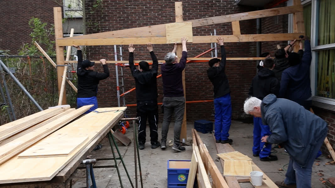 Maandag arriveerden de leerlingen uit ons buurland en werd er gestart met een introductie bij het ROC Da Vinci College op het Leerpark. Dinsdag kregen de leerlingen een rondleiding in de Duurzaamheidsfabriek en werden daar direct beugels van metaal gemaakt om de luifel aan de muur te bevestingen. Woensdag werd de voorconstructie afgerond en gingen de mannen aan de slag bij de locatie van stichting Geef het Dordt op de Staart.