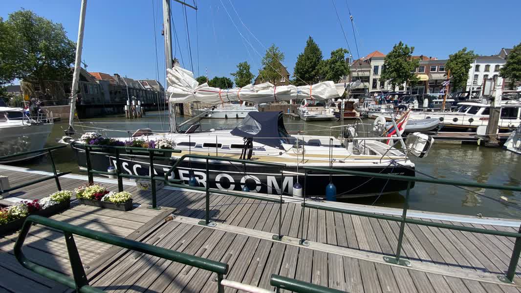 Een ongewoon beeld maandagavond op de Edisonweg in Alblasserdam: een plezierjacht van zo'n 12 meter ...
