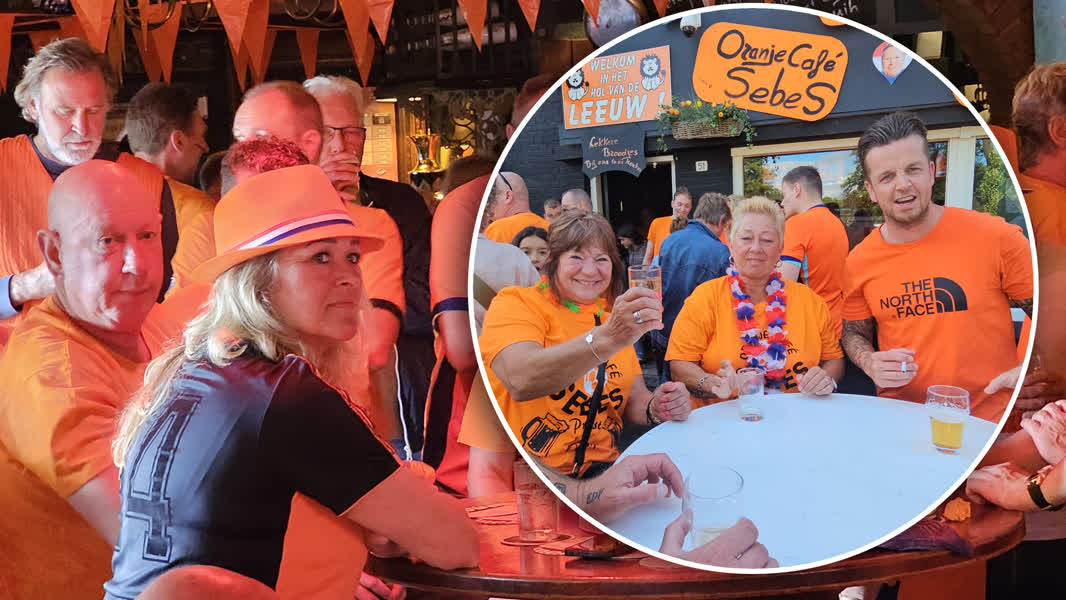 Die decoratie komt de sfeer ten goede als de wedstrijd begint. Het café is goedgevuld, zo'n vijftig a zestig gasten zitten vol spanning klaar. Het eerste kwartier is voor Nederland, dus vloeit het bier rijkelijk.