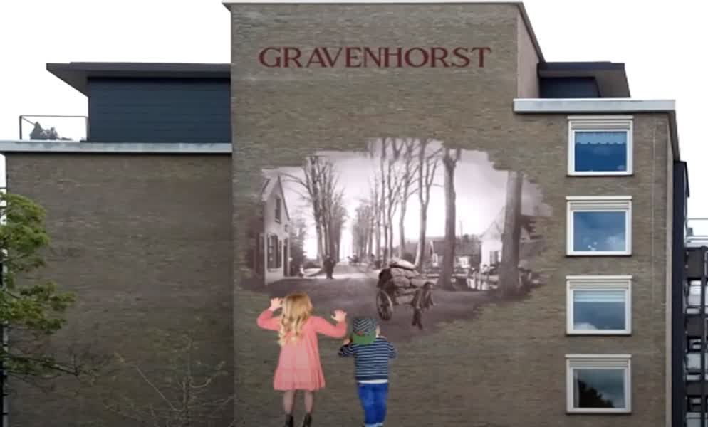 In Dordrecht openbaart zich sinds vorige week langzaam een reusachtige muurschildering op de zijgevel van het senioren wooncomplex Gravenhorst. Inge Modderkolk (21) is de bedenker en uitvoerder van de klus. "Natuurlijk ben ik hartstikke trots dat ik dit mag doen."Vanwege het 50-jarig bestaan schreef de Gravenhorst een wedstrijd uit wie het beste idee had voor een opfleuring van de saaie gevel en Inge werd de winnaar. "Ze wilden dat het heden gecombineerd werd met het dorpse karakter van het Dubbeldam van vroeger.""Mijn idee was dat twee kinderen uit het heden, dus in kleur, door een gat in de muur kijken naar het verleden." Ze gebruikt daarvoor een foto uit 1903 van de Dubbelsteynlaan, die langs het gebouw loopt. Ze begon met een collega van het schildersbedrijf waar ze werkt vorige week aan de klus.Eerst werd een wit vlak gemaakt, waarop 's avonds laat met een projector de foto als dia op de muur geprojecteerd werd. "Op die manier konden we de contouren op de muur tekenen", vertelt Inge. Daarna ging ze met de verfspuit aan de slag."Ik heb al vaker zoiets gedaan, maar nog nooit zo groot. Dit smaakt inderdaad naar meer." Dagelijks bekijken mensen haar vorderingen. "Ik krijg ook leuke reacties. Het is echt tof." Maandag hoopt ze het 15 bij 11 meter grote werk af te ronden. www.youtube.com/watch?v=rtlCJplXuig