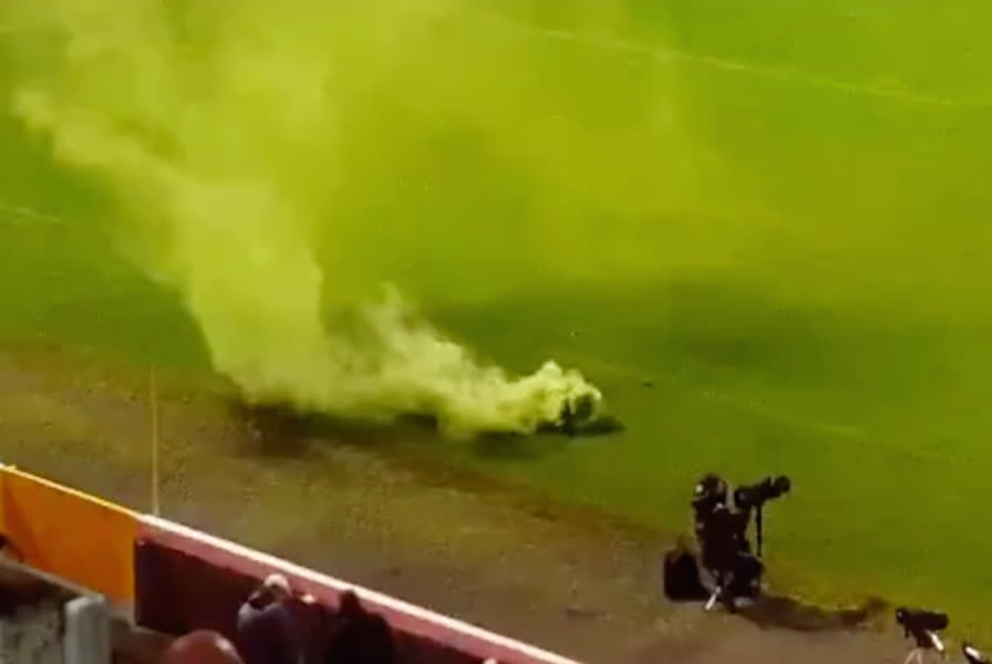 “Supporters” van FC Dordrecht hebben tijdens het herdenkingsmoment voor de aanslagen in Parijs bij de wedstrijd Racing Mechelen-La Louvière rookbommen en voetzoekers gegooid.