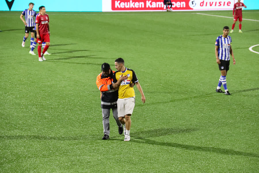 Na ruim twintig minuten volgde een merkwaardige onderbreking. Niet een plastic bekertje, maar een laveloze supporter kwam op het veld. Na een vriendschappelijke knuffel en korte woordenwisseling met een nietsvermoedende Ilias Bronkhorst werd de dronkenlap van het veld gehaald.
