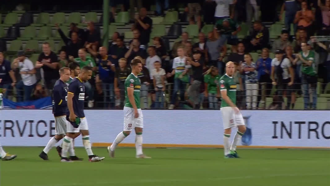 De eerste goal van Roda JC ontvingen de Dordtenaren met groot gejuich. De ongelukkige Daryl Werker kopte een vrije trap van Jari Schuurman achter Roda-keeper Tom Muyters. De voorsprong van de Schapenkoppen strandde enkele seconden voor rust. Op het randje van buitenspel ontving Ike Ugbo de bal en liet met FC Dordrecht-keeper Petar Stoskovic kansloos.