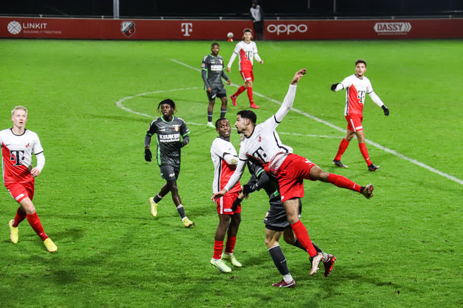 Een luchtduel in de wedstrijd Jong FC Utrecht - FC Dordrecht Corrado Francke