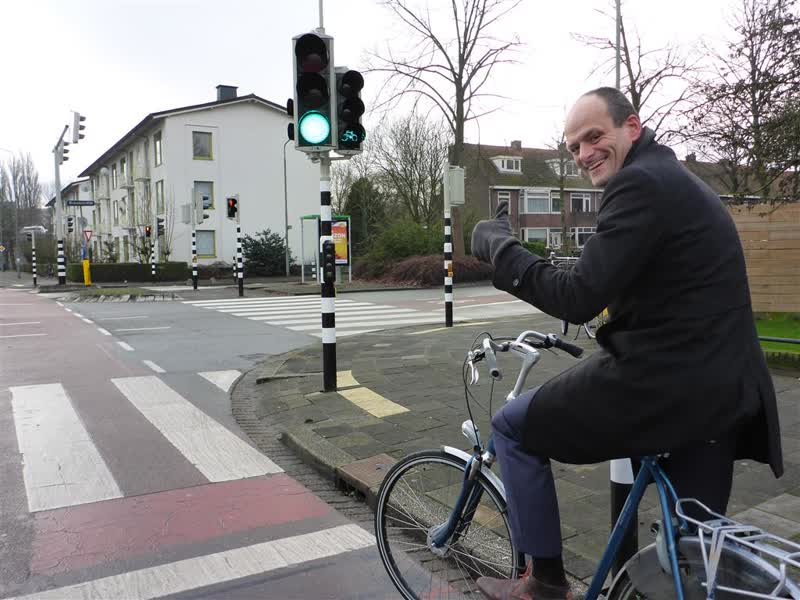 Foto: verkeerswethouder Rik Van der Linden fietst over kruispunt Krispijnseweg
