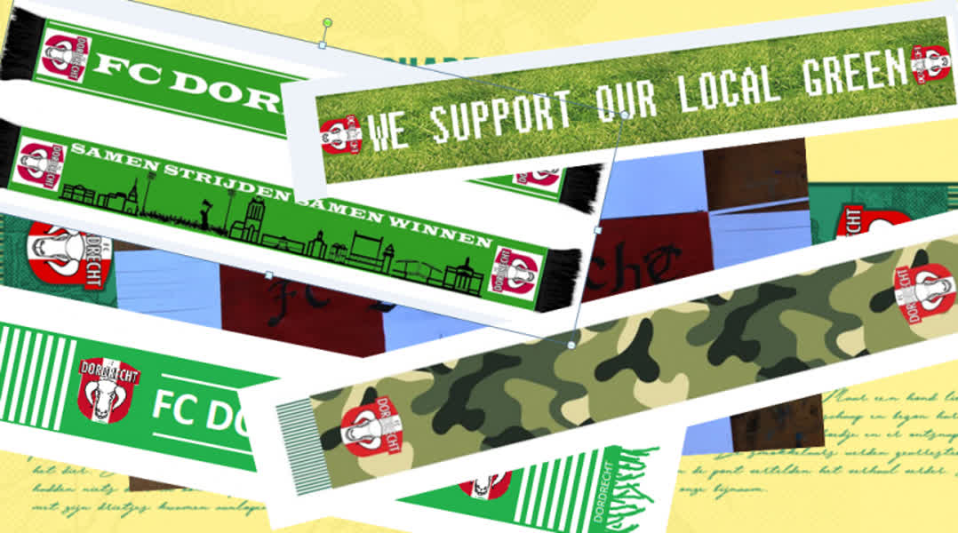Drie ontwerpen van de nieuwe sjaal FC Dordecht staan in de finale van de sjaalwedstrijd.