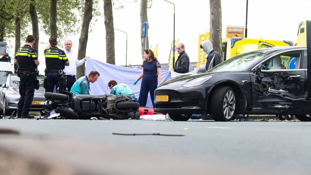 De man kwam in botsing met een automobilist. De auto heeft aan de zijkant veel schade opgelopen. Ook de motor is flink beschadigd.