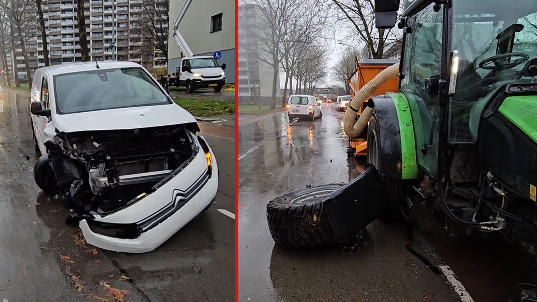 Volgens een 112-correspondent ging het mis toen de bestelbus de trekker, die aan de linkerkant van de weg bladeren aan het wegzuigen was, over het hoofd zag. Beide bestuurders kwamen met de schrik vrij, al hadden beide voertuigen wel veel schade. De trekker verloor een wiel, de bestelwagen heeft aan de voor- en zijkant schade.