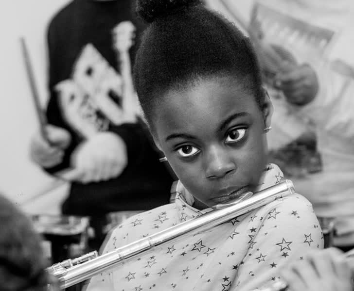 Fotograaf Huib Kooyker legde kinderen vast tijdens een les van het Leerorkest Drechtsteden op school . De foto’s worden tot 29 augustus getoond in de hal van het Stadskantoor.