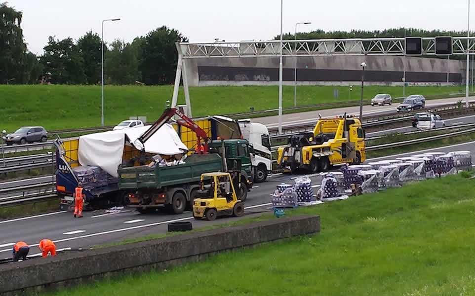 De bestuurder raakte in het begin van de tunnel de tunnelwand, maar reed door om zijn wagen even buiten de tunnel langs de weg te zetten. De hele tunnelbuis ligt daardoor vol Fristi en moet worden schoongemaakt. Dat gaat waarschijnljk tot rond 11.00 uur duren.