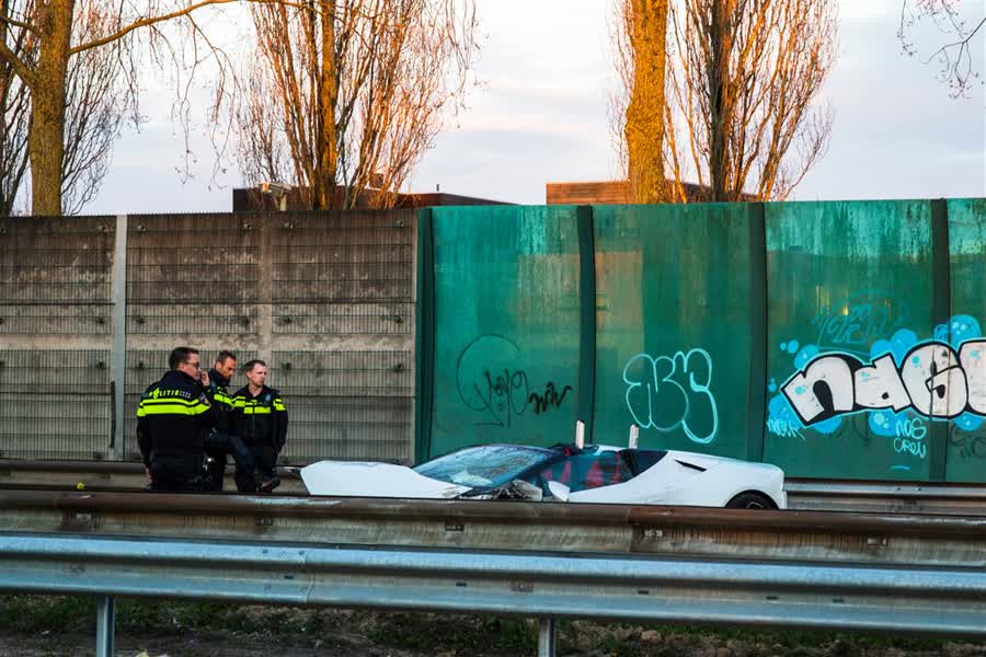 De Lamborghini Huracán - met een nieuwwaarde van zo'n 318 duizend euro - belandde woensdag in de vangrail op de N3. Volgens de politie zaten twee mannen in de auto, die na de crash op de vlucht zijn geslagen.