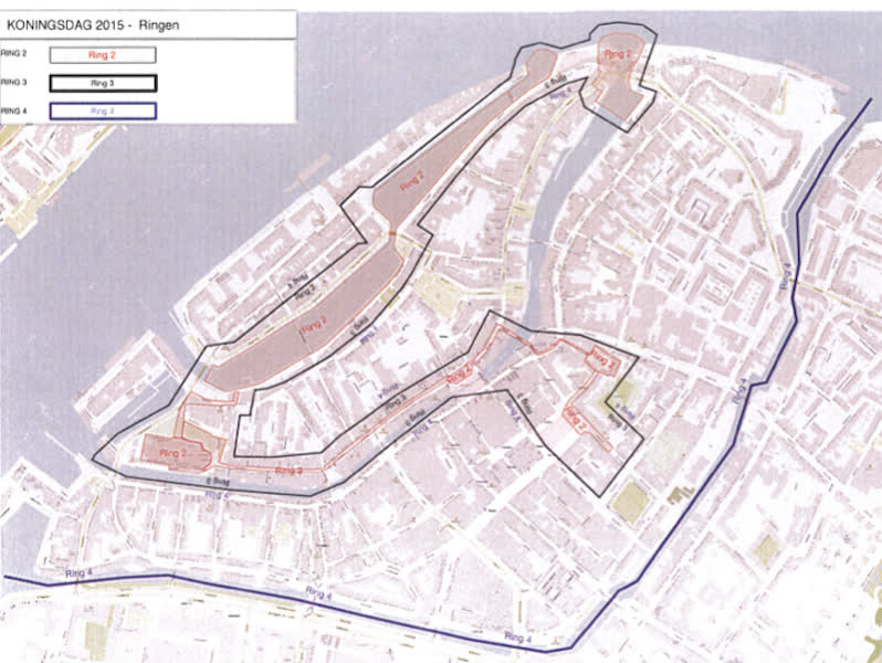 In een speciale Koningsdagverordening zijn meer voorschriften opgenomen. Zo is de binnenstad in vier veiligheidsringen ingedeeld (illustratie). De een strenger dan de ander. In de buitenste twee ringen is het onder andere verboden om alcohol te nuttigen, vuilcontainers, bloembakken en (brom)fietsen buiten te laten staan en . In veiligheidsring 2 geldt een verbod voor onbevoegde personen. Ook mogen toezichtshouders preventief fouilleren.