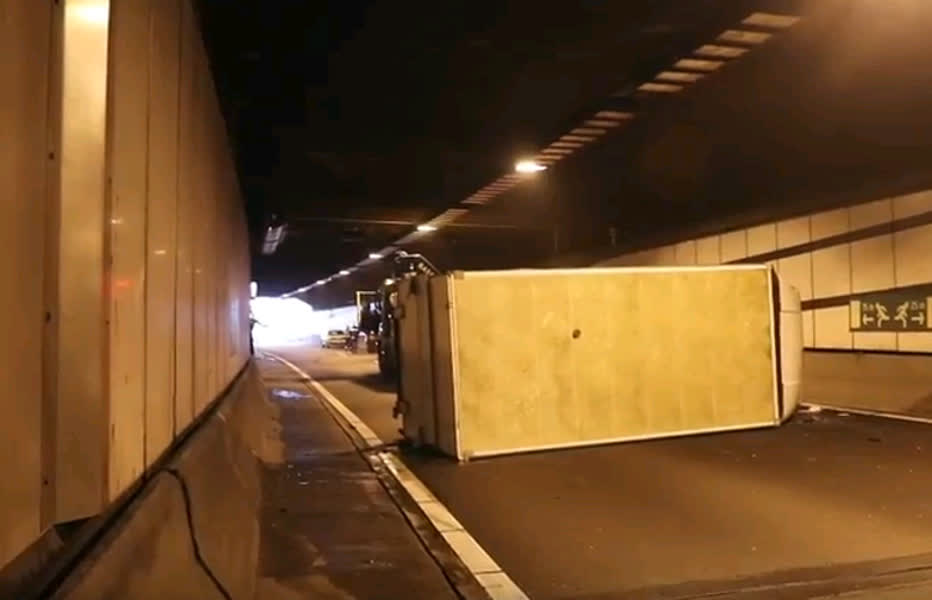 In de Drechttunnel is vanmiddag een bestelbus gekanteld. Hij zou zijn gaan slingeren en tegen beide tunnelwanden zijn geklapt.