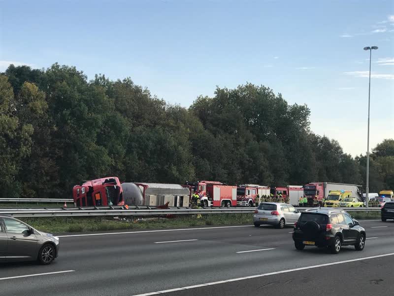 Op een van de vrachtwagens is een bestelbus ingereden, er zijn minimaal twee slachtoffers naar het ziekenhuis gebracht. Inmiddels zijn twee rijstroken vrijgegeven. Rijkswaterstaat gaat na de spits de gekantelde vrachtwagen bergen. Weggebruikers moeten rekening houden met vertraging.