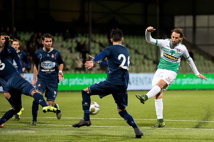 De thuiswedstrijd van FC Dordrecht tegen Telstar leverde een laat gelijkspel op, 2-2.