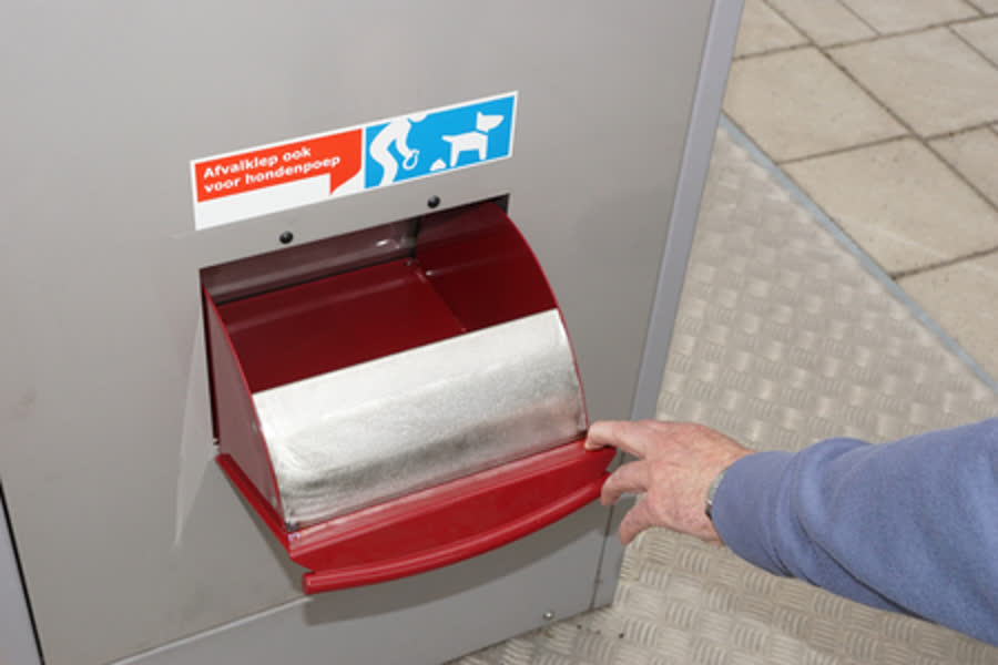 Om hondenbezitters erop te wijzen dat de zakjes poep in de ondergrondse afvalcontainers mogen worden gegooid, zijn er stickers geplaatst op 54 containers. De kleine klepjes trek je zo open. De grote afvalklep gaat alleen open met een pasje.