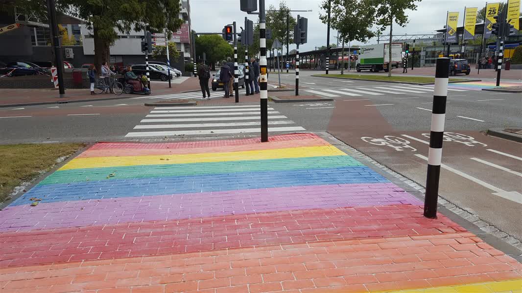 Mensen reageren gemengd op de regenboogzebrapaden voor het station. Niet iedereen begrijpt de achterliggende gedachte.