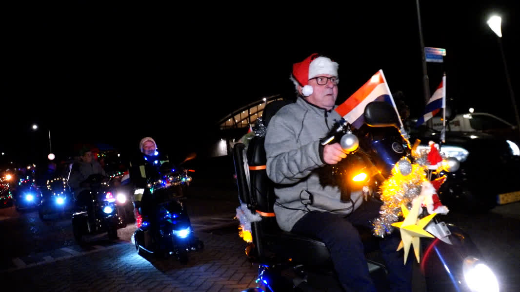 Het is vrijdag, even na 18.30 uur, en de een na de andere verlichte scootmobiel rijdt het Wilgenplein op. Om één scootmobiel kan niemand heen: het is die van Bart zelf, die versierd is met kerstballen, sfeervolle lichtjes en Nederlandse vlaggetjes. Toch springt de halve meter hoge speakerbox achterop de scootmobiel het meest in het oog.