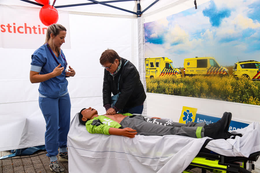 Bij de hoofdingang stonden medewerkers van het ambulancepersoneel en verpleegkundigen klaar met een aantal oefenpoppen, AED's en instructieschermen om ziekenhuisbezoekers goed wegwijs te maken. Onder hen ook Denise van der Kleij, zij is verpleegkundige op de intensive care "we merken vaak dat mensen achteraf terugkijken op een noodsituatie en denken: had ik toch maar een cursus gedaan, dan had ik geweten wat ik had moeten doen."