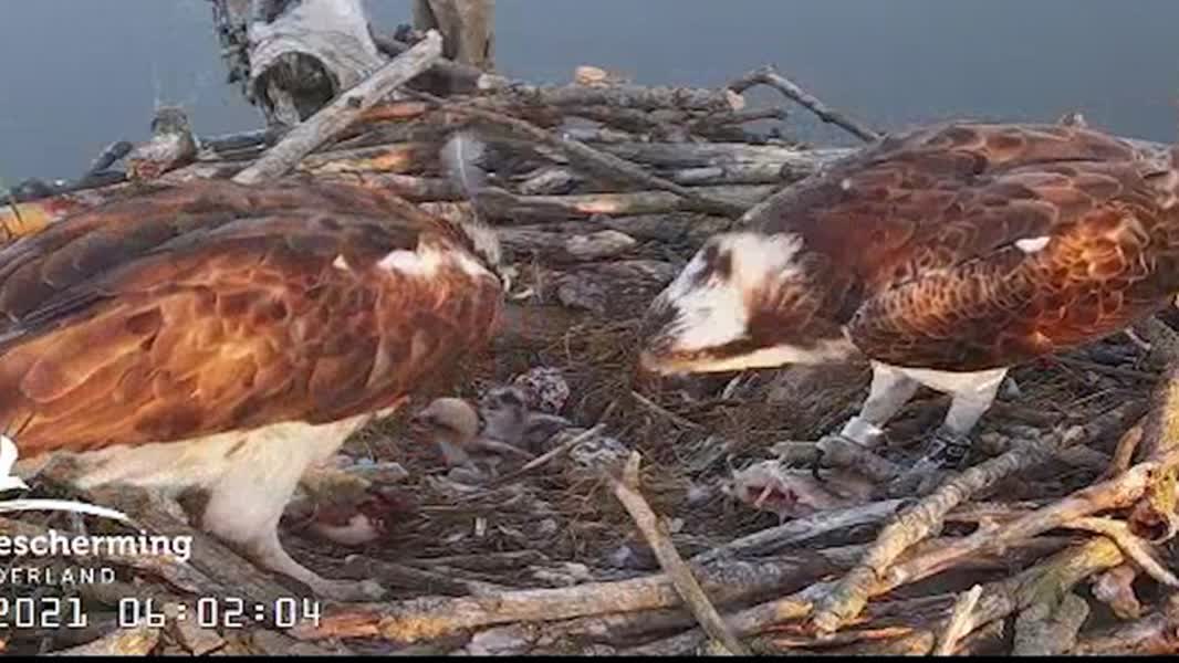 "Er moet continue voer worden aangebracht door de oude visarenden. Er zitten nu drie jonge pullen op het nest die hebben van die kleine zwarte boevenmaskertjes. En die moeten de komende weken uitgroeien tot volwaardige arenden en dan is er maar éen ding nodig en dat is vis," vertelt Boswachter Van Es.